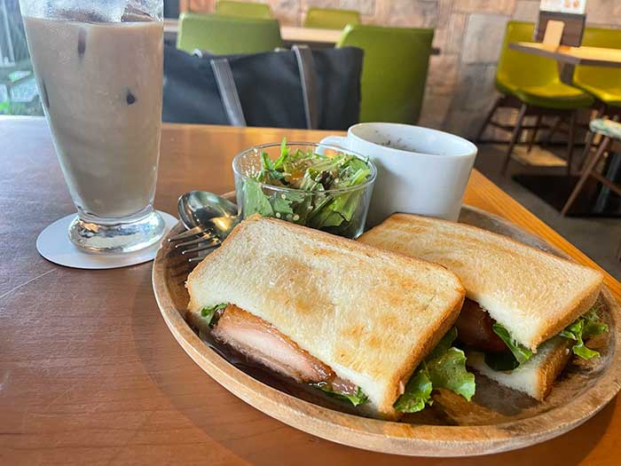 静かな喫茶店でサンドウィッチのランチを。選んだのはテリヤキチキンサンド1,188円。暑かったのでアイスカフェオレにしました。