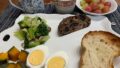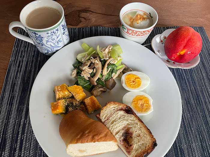 ポワンタージュのパンで朝ごはん。左は塩パン。右はデニッシュブレッド ショコラフワンボワーズ。甘いのとしょっぱいのを少しずつ取り合わせました。