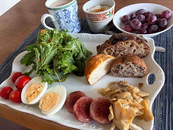 引き続きパンストックのパンで朝ごはん。今朝はロールパンセットの中からと大きいパンの一切れという組み合わせ。色々味わえて嬉しい。