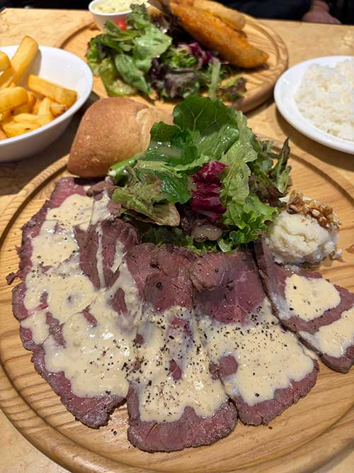 私はローストビーフのランチ1,300円にしました。毎晩何かしらのサンマ料理を続けているため、お肉を食べたい気持ちになっていました。夫はフライランチ1,400円でいろんなフライの盛り合わせ。