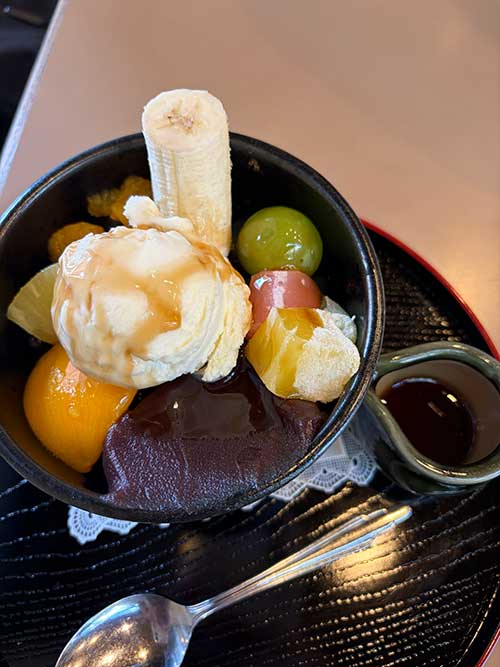 私はクリームあんみつ800円。缶詰以外にもフレッシュフルーツがトッピングされていたりして、季節ごとに着たくなる感じ。シャインマスカットも嬉しい。バナナは夫へ。