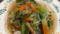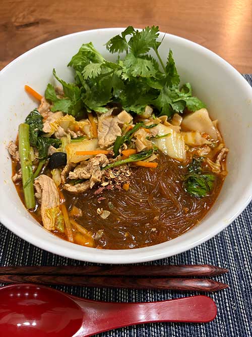 夫はある程度辛くても良いので先に作り、辛いタレをほぼそのまま使用。私はほんのちょっと垂らす程度にしました。具は、空芯菜、パクチー、ニンニク、鶏のささみの酒蒸し、にんじん、白菜、冷凍の水餃子。