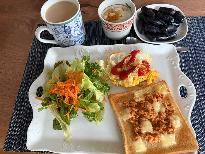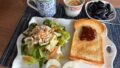 今朝は鮭フレークが大量に在庫があるため、ツナマヨ感覚でマヨネーズと合わせてパンの上に乗せました。溶けるスライスチーズが残念ながら1枚しかないため、苦肉の策として市松模様にして夫のトーストとシェア。たまにはちょっとくらい可愛い感じにしようとしております。
