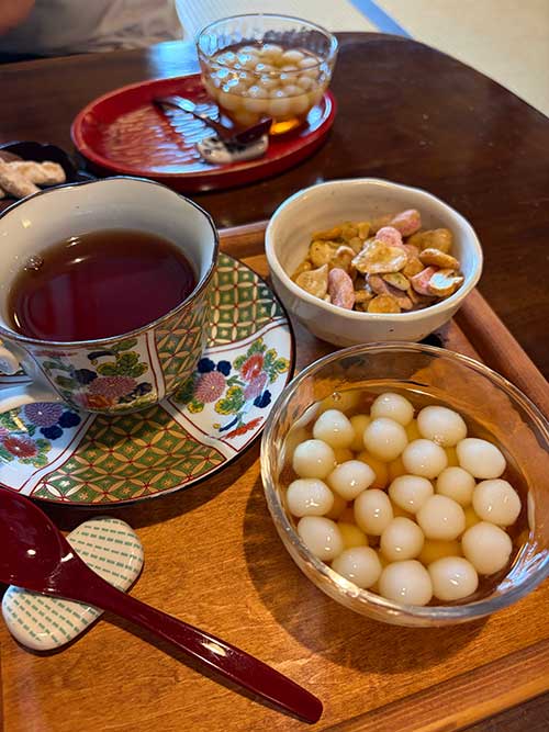 私は銀水セット1300円。かんざらし、添えがし、飲み物がセットになっています。添えがしにはチェリー豆。なんか懐かしい。空港でチェリー豆含む豆菓子セットを購入しました。かんざらしは2gずつ計って丸めているそうで、この小さな可愛らしい粒感が良いです。シロップは九州らしくしっかりと甘いです。飲み物は島原和紅茶にしたのでいい感じにスッキリとさせてくれました。