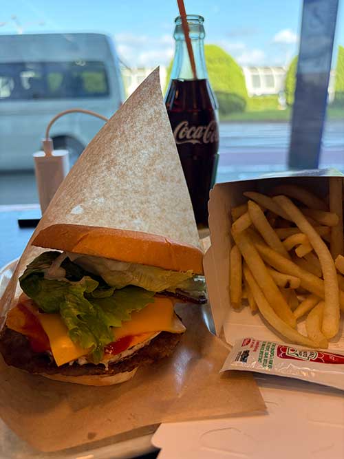 スペシャルバーガーのSで944円。佐世保バーガーは大きいと聞いているのでSサイスにしましたが、この時の私にはちょうどよかったです。デフォルトのハンバーガーに、ベーコン、たまご、チーズがサンドされていて、些か今日の私には卵過多かも知れませんが旅行だからよしとします。おともにはヤンキーポテト(塩)348円。そして瓶のコーラ220円。