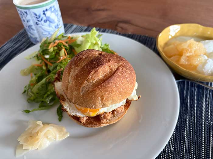 長崎旅行の最後の方で立ち寄った道の駅で買った丸いパンで朝ごはん。あまり材料がなくて、鮭フレークをマヨネーズで和えたものと目玉焼きとチーズでサンドウィッチにしました。