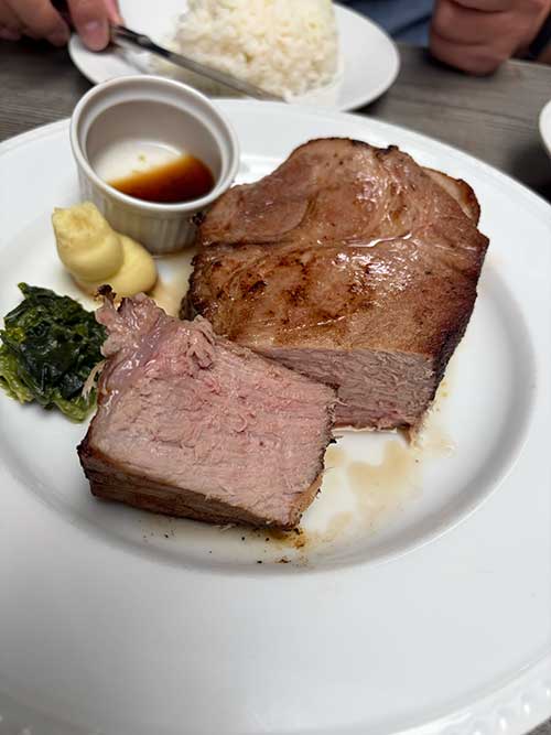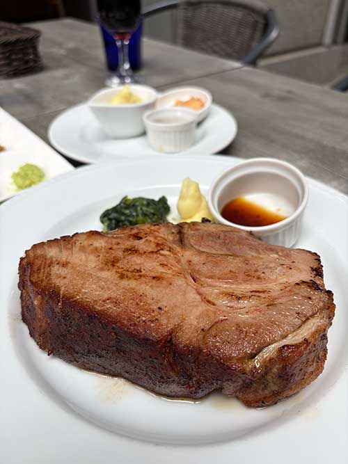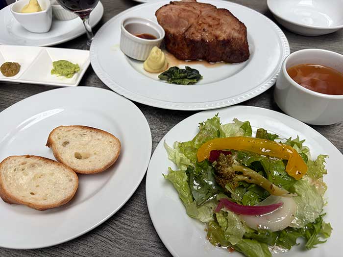 でお昼はどうしようとなった時、1階にマロリーが入っていることがわかり、行ってみました。お肉をどれくらい食べられるかがよくわからないので、あと色々きちんと把握ができていないのでとりあえずな感じで、450gの富士山、サラダ・ライス(私はパン)・スープセットをそれぞれつけ、夫はアルコール。