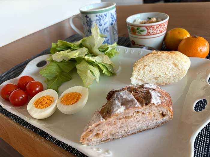 尼崎のパン屋さんで夫が買ってきてくれたパンで朝ごはん。ものすごく可愛いパンもありましたがそれは後日のお楽しみで、今回はくるみ&いちじくと塩パンの取り合わせにしました。どちらも素朴で美味しいパンでした。