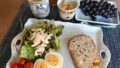 PASCOのくるみカンパーニュでサンドウィッチの朝ごはん。千切りキャベツを卵で閉じて、ハムとチーズと一緒にサンドしました。