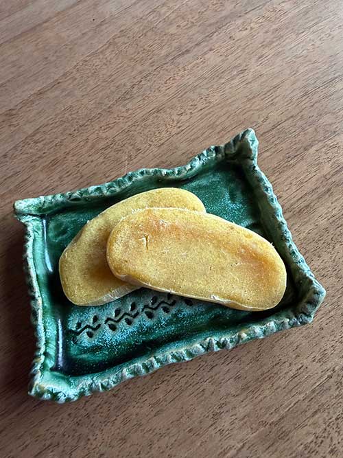かんころ餅は大好きな長崎の郷土菓子。ナマコ状に成形されたものを1センチくらいにスライスし、トースターで焼いて食べます。
