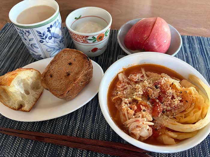 昨日の晩御飯がトマトシチューで、多少残ったのでそれをベースにまた野菜などを足してスープにしました。卵も落としています。