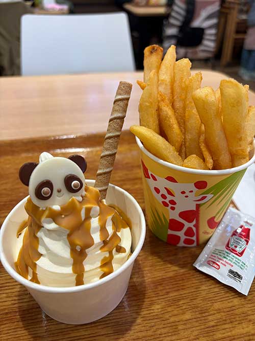 ソフトクリームを後に食べたいのですが、気が気ではないので熱々のポテトにケチャップをつけながら無心でハフハフと食べました。久しぶりにこんな感じにポテトを食べたかも。揚げたて美味しい。ソフトクリームはキャラメルソースがカチッと固まっていてパリパリになっているのが好き。パンダチョコレートも刺さったクッキーもどちらもなんだか懐かしい感じ。