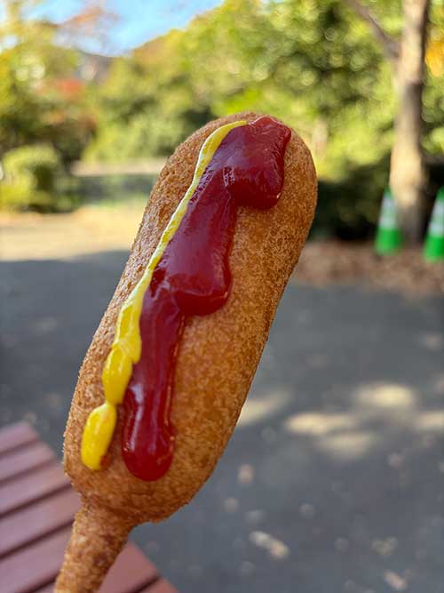 マスタードもケチャップもたっぷりつけて、熱々をいただきます。アメリカンドックも久しぶりで美味しい。