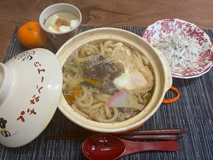 冬に贈ってもらう辻麺のきつねうどんと肉うどん。今朝は肉うどんで。卵とか白菜、カボチャも色々入れて鍋焼きにしました。大根は、わかめふりかけの袋に残っていた塩っぽいところを全部使って浅漬け風に。