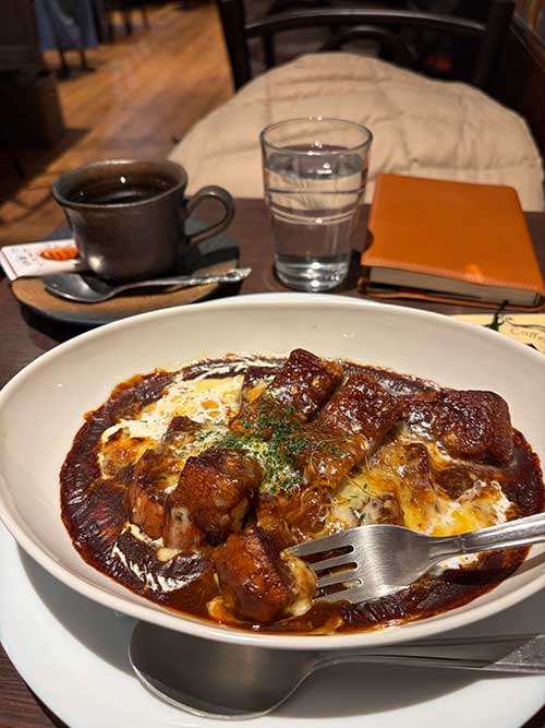 最後に伴茶夢で冒頭のチーズ焼きパンカレー1400円を。ランチタイムなのでコーヒー付きとなります。熱々で、チーズもとろとろでとても美味しかったです。コーヒーには玉ねぎのクッキーも付いていて嬉しい。