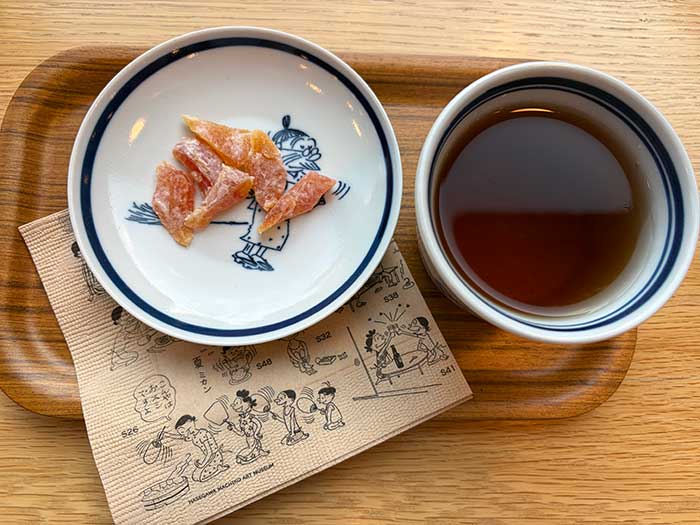 ほうじ茶ドライパパイア付きで500円。入場時に100円割引券をいただけたので、実質400円。