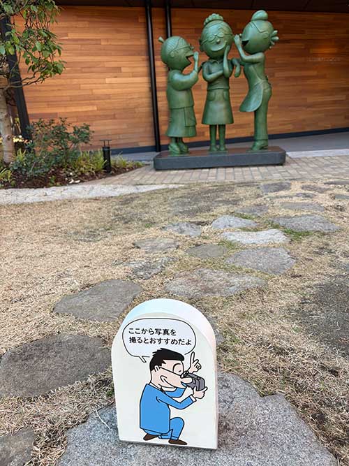 お次は道を隔てたところにある記念館へ。入り口前に撮影スポットがあります。
