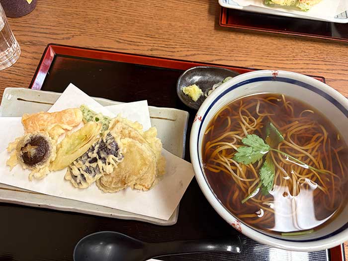 私は野菜天のあったかいお蕎麦にしました。なんせ寒かったので。天ぷらも熱々サクサクで美味しかったです。夫は何かしらの定食形式だったかな。ここはふりかけが3種添えられるので白いご飯を食べたかったらしい。