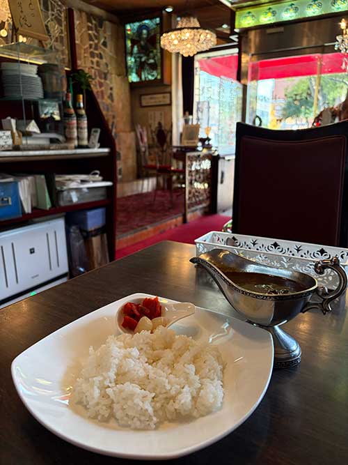 お昼はずっと気になっていたコーヒーの大学院 ルミエール·ド·パリへ。混んではいましたがちょうど本当の一人席が空いたようですぐに着席できました。冒頭の写真のように入り口側のゴージャスな席とシャンデリアを斜めに愛でながらのスペシャルビーフカレー コーヒーセット1,300円を頂きました。