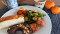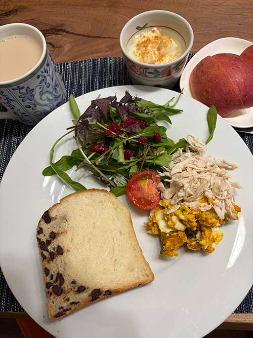 MATINで買ったクリスマス限定のチョコとマカダミアナッツが入ったパンで朝ごはん。普通に平日の朝なので、サラダとか鶏ささみの酒蒸しとかカボチャのサラダとか、日常のメニューで。