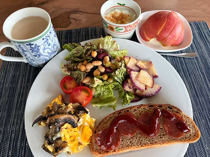 全粒粉入りのいつものパンに、パルメザンチーズをどっさり焼き込んだパンで朝ごはん。ケチャップを塗ってからサラミソーセージをのせようと思っていたのですが、うっかりサラミだけ並べて焼いたので、後から描けました。各自ケチャップを伸ばすことに。