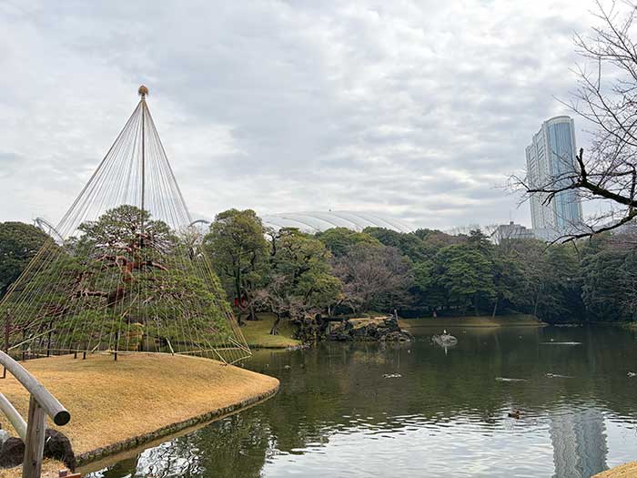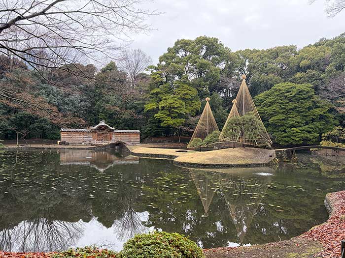 どんよりした曇りの日でした。冬の風物詩の雪吊りが美しい。