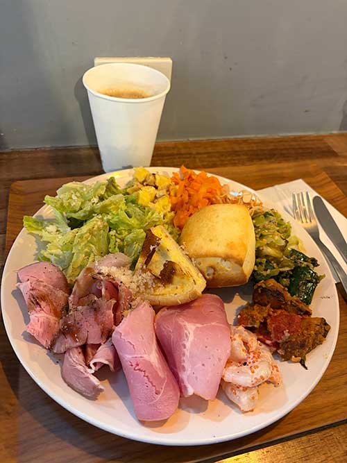 デリは2種類ほどエビとかで食べられないものがありましたので、夫へまるまるパス。夫はデミグラスハンバーグのプレートでハンバーグを少しシェアしてくれました。