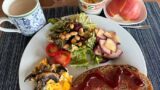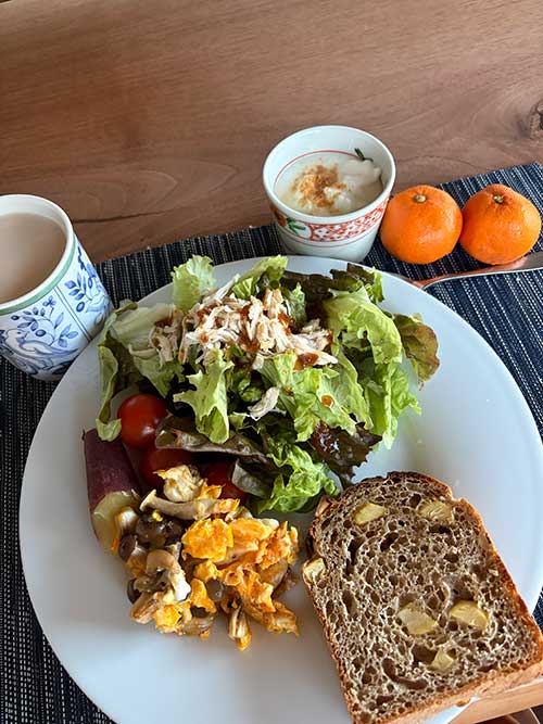 栗の甘露煮を焼き込んだパンで朝ごはん。バターを塗るといいなという夫の意見もありつつ、バターを最近全然買っていないのでつい忘れてしまいます。