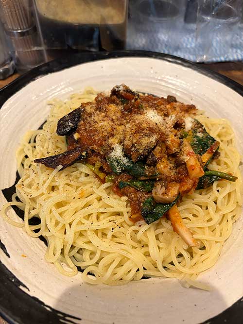 私はミートソースなすきのこほうれん草1,200円を180gで。デミグラスソースを掛けるかどうかを聞かれましたが多分ミートソースは初めてかもなので、デフォルトで食べたくて無しにしました。