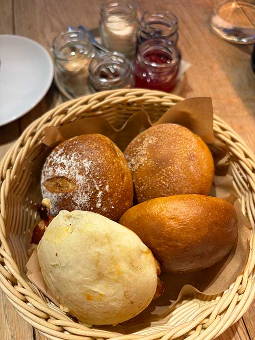 まずは夫のパンセットは、デフォルトで3種のパン(BeBeパン、パンコンプレ、パンブリオッシュ)があり、さらにプラスワンで選べるラインナップからはタマゴとベーコンのパーカーズを。5種のディップ(ジャム2種、ホイップバター、ピーナッツバター、チョコレートクリーム)がセットになっています。どれもシェアして食べましたが素晴らしく美味しい…。