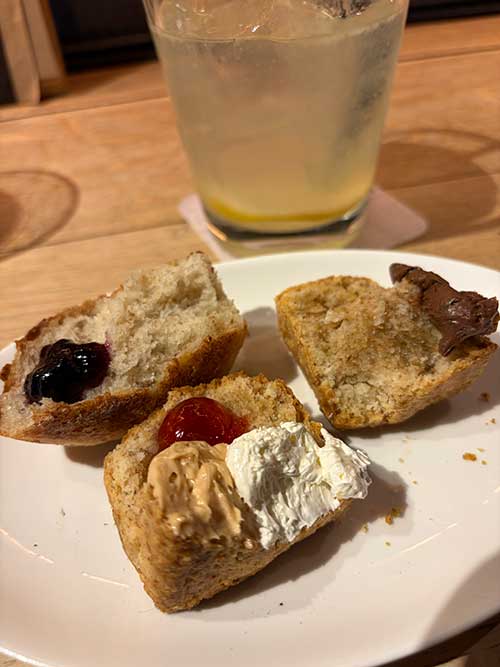 私は夫のディップもシェアする目論みで全粒粉のスコーン240円とプリオッシュのオレンジ350円を、レモネードのソーダ割り380円で。