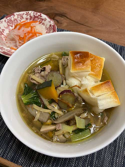 お昼は豚汁をたっぷり作り、餅を焼いて入れました。これを我が家のお雑煮とする方向となりました。