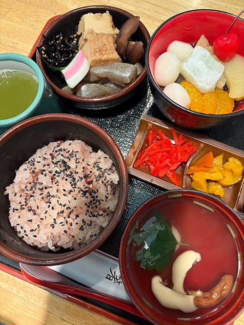 想像以上にバランスが良く程よいボリュームで私の最適解だとわかりました。赤飯とお吸い物、煮物、香の物、甘味というラインナップです。お赤飯はいつもいつも食べたいと思っているもので、お赤飯という赤飯メインのメニューもありましたが、煮物が強い。