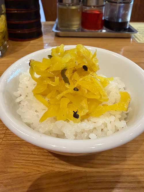 ご飯は必ずつけて、卓上のタクワンをてんこ盛りにしてワシワシと食べるのも好き。