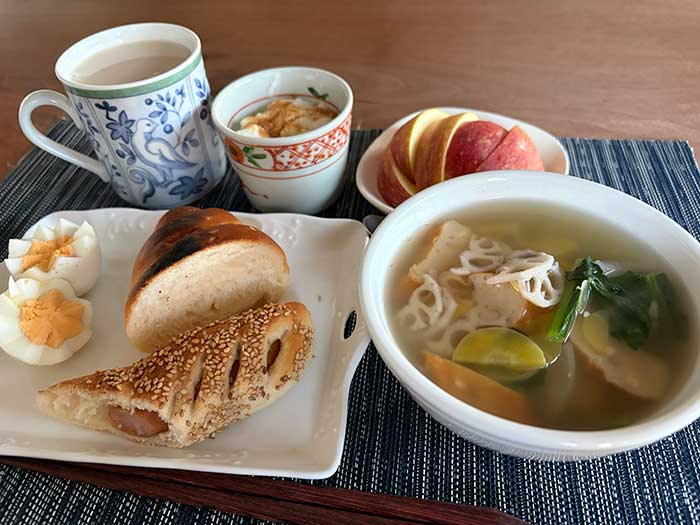 めちゃくちゃ寒い朝でしたので、根菜類などの具沢山の和風スープにしました。