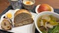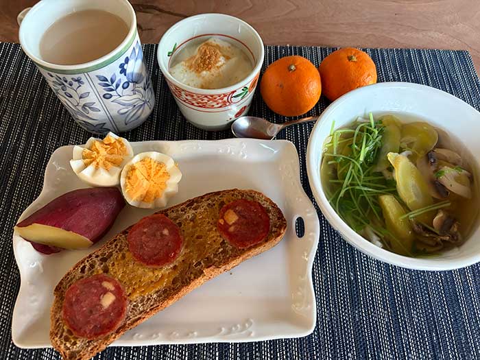 夫のおつまみ用のちょっと良いサラミを朝ごはんにも流用。ハニーマスタードを塗ってから乗せてトーストしました。スープは豆苗とか椎茸とかにんじんとか使いたい野菜をとにかく入れて煮込みます。さつまいもは買った時に蒸して冷凍しているので、解凍します。ゆで卵は、そういえばギザギザに以前カットしたなあと思い出し、時間が許す限り実践しています。