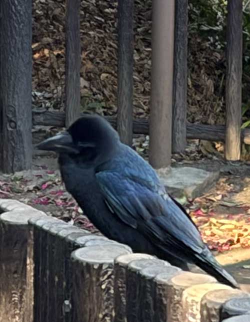 この日の午前、歩いていたら急に頭を何かで掴まれた感触があり、びっくりして声が出てしまいました。振り返っても誰もいない。人に襲われたのではない?と訝しんでたら、突然バサバサっと1羽のカラスが目の前に降りてきました。