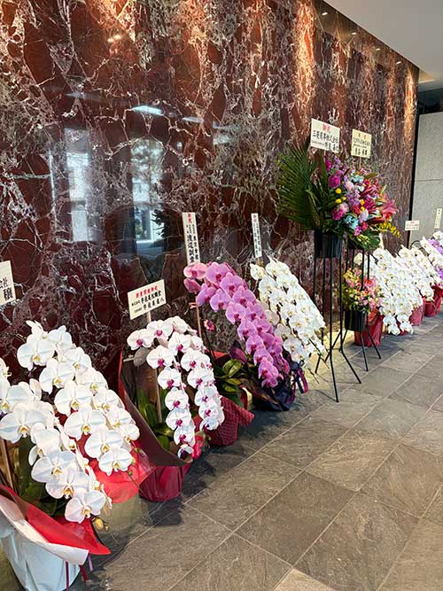 エントランスにはお祝いの胡蝶蘭がずらりと並び、華やかな香りに包まれていました。