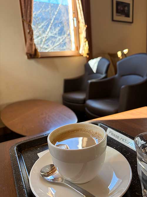 2階に席をとりました。飲み物は黒糖のミルク珈琲です。