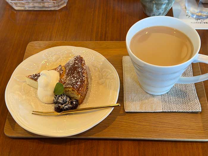 夫はカフェオレ600円とベイクドチーズケーキ700円、こちらも100円引き。
