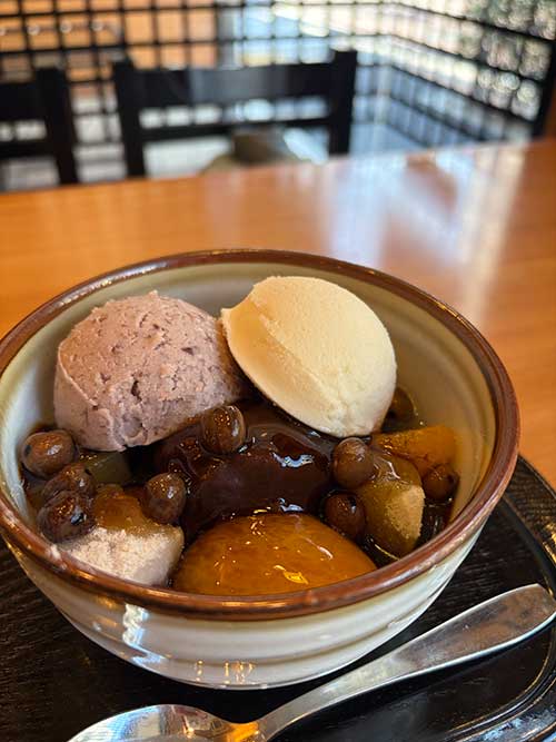 アベックあんみつ700円を注文しました。アベックというのはバニラアイスと小倉アイスの両方が乗っているからだそうです。どうせならどちらも食べたい。