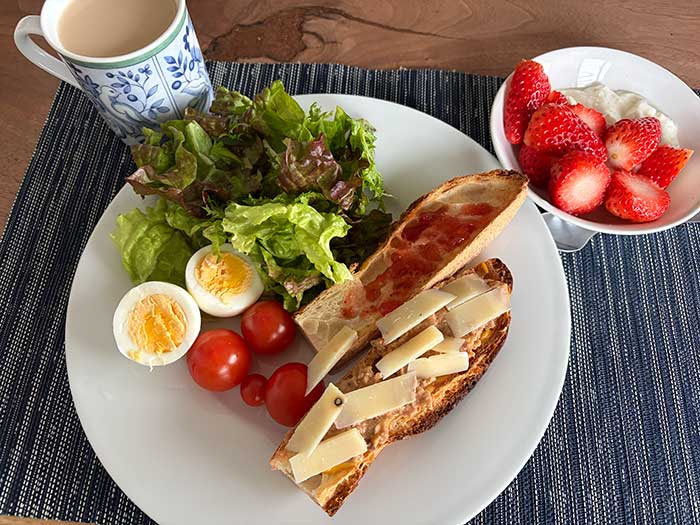 VIRONのバゲットにサバのリエットを塗ってペコリーノブラックペッパーを乗せて朝ごはん。昨夜ひょっこりバゲットを買ってきてくれたので、そろそろ使おうと思っていたカルディで買ったこのリエットの缶を開けることにしました。