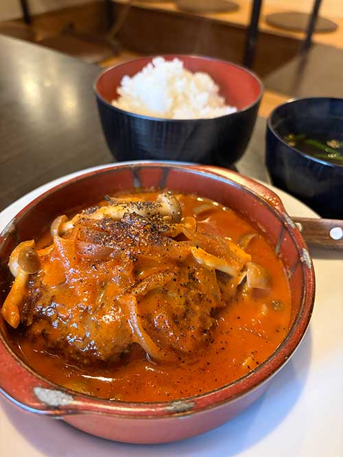 サラダなどをいただいていると、冒頭の熱々のハンバーグが運ばれてきました。トマト煮込みも美味しい…!前回はオリジナルデミソースで同様にご飯がしっかり進みますし、何より肉をガツンと食べている気持ちになれます。