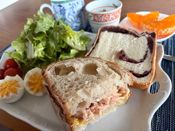 夫の神戸土産のパンで朝ごはん。トミーズのあん食はそのまま。ベイクのカンパーニュはマスタードなどを塗ってマヨを和えたツナをサンド。方向性の違うパンを同時に味わえる朝ごはんは贅沢だな。