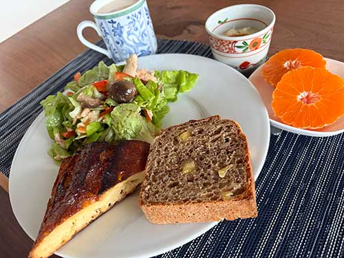 BAKEのフレンチトーストと、自家製のマロンのパンなどで朝ごはん。