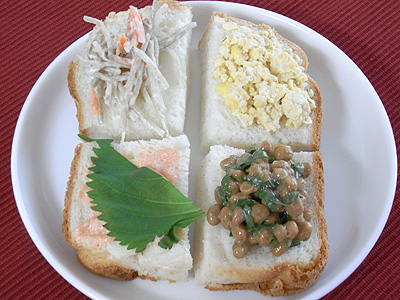 左上から、ごぼうのサラダ、味噌マヨ味の炒り卵、青じそ納豆、明太マヨ。