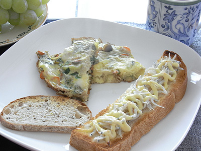 右側は、イギリスパンに釜揚げシラスとマヨネーズのトッピングをして焼いたもの。