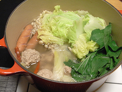 葉物野菜と豚つくねで、辛いスープにした鍋にしました。