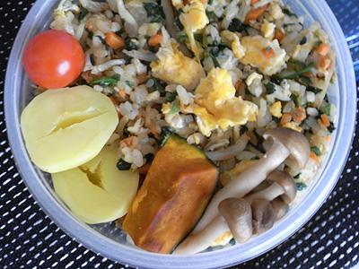 色んな野菜やきのこを刻んであたかもガッツリボリュームチャーハン弁当のよう。