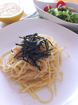 皮から外した明太子に、とかしバターとEVオリーブオイルを混ぜたソースに、